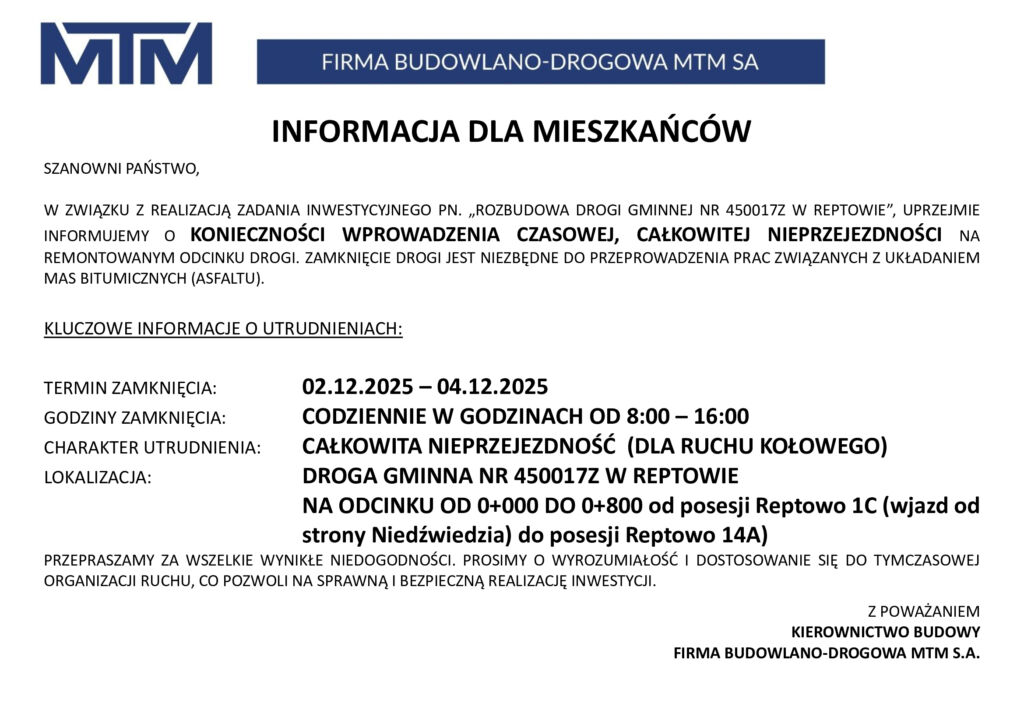 Planowane zamkniecie drogi Reptowo 02.12.2025 – 04.12.2025