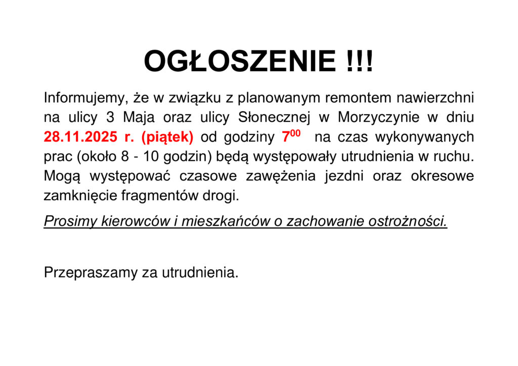 UTRUDNIENIA W RUCHU NA ULICY 3 MAJA I ULICY SŁONECZNEJ W MORZYCZYNIE