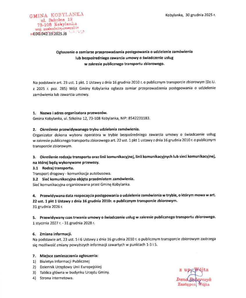 Ogłoszenie o zamiarze przeprowadzenia postępowania o udzielenie zamówienia lub bezpośredniego zawarcia umowy o świadczenie usług w zakresie publicznego transportu zbiorowego